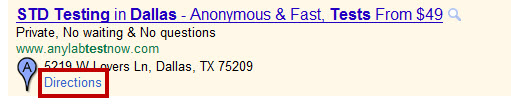 Google Directions is a feature of local extensions that allows customers of Pay Per Click advertisers to “map the quickest route from where they are located to a business they want to visit.” Directions has shown to increase interactions with ads and be beneficial to users. When a Pay Per Click advertiser enables the location extensions feature, they can also activate the Directions option. A typical ad with the Directions feature engaged looks like this:
