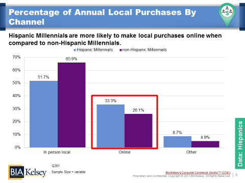 Hispanic millennials are more likely to shop online than their non-Hispanic cohorts. Thirty-three (33%) of Hispanics millennials report going online to make local purchases compared to just 26% of non-Hispanic millennials. Hispanic millennials are also more likely (30%) to use their tablet daily for local shopping than non-Hispanic millennials (19%).