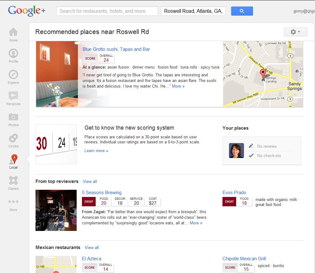 When you click on your new “Local” tab in Google+ you will be taken to your personalized local home page where you will see a variety of recommended places near your home including restaurants, greenhouses, clothing stores, and places top reviewers recommend. You will also be able to see the places you have reviewed and checked-in at. Want to search for locations in a place you are visiting this weekend? No problem, just change your location at the top of the page.