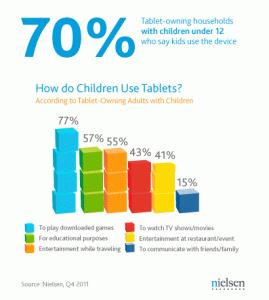 Turns out you are not alone. Research recently released by Nielsen reveals that the tablet is all the rage in the 12 and under set. According to a Nielsen survey of adults with children under 12 in tablet-owning households, “in Q4 2011 seven out of every 10 children in tablet-owning households used a tablet computer – a nine percent increase compared to Q3 2011.”